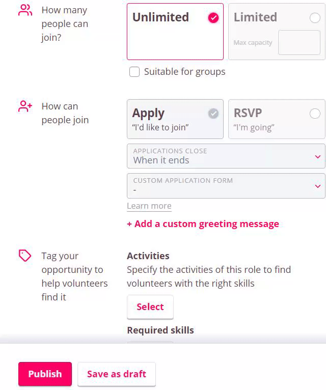Here you can indicate how many volunteers you are looking for, whether you want to close the opportunity when the number of volunteers is reached, and whether the opportunity is suitable for groups.