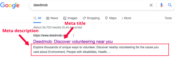 Organisation name: e.g. "Seaching for volunteer work that suits you in Location! Find the best activities for volunteers on Organisation name."