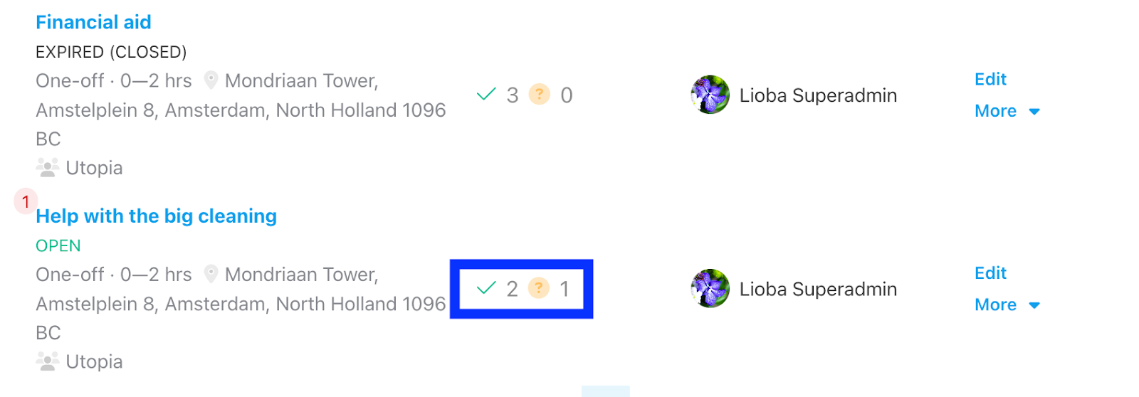 Next to each opportunity, you can see how many spots are available and how many applications have been submitted. The check mark and question mark indicate how many matches there are and how many applications are pending. Click on these icons to view all applications and applicants.