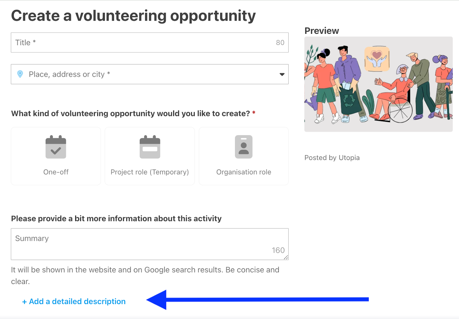 Fill in all the fields on the next page and provide as much information as possible about the volunteer opportunity. Then click “Publish” to post it.