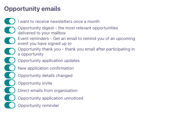 You can unsubscribe and subscribe from different notifications by clicking on the buttons next to the notification description. If they are grey, you are unsubscribed from the email notification. If the button is coloured, you are subscribed.