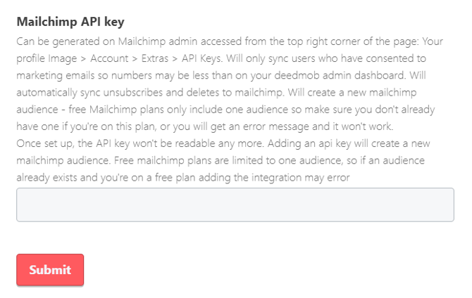 To find your Mailchimp API key, log in to MailChimp and follow this link: https://us18.admin.mailchimp.com/account/api/. Then click on 'Create API Key' and paste it into the above 'Mailchimp API Key' on your Deedmob organisations' website.