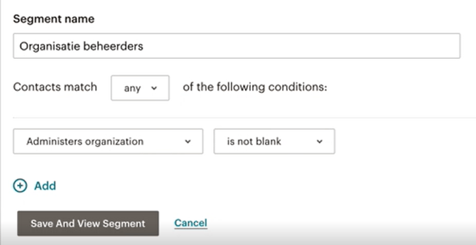 Segments are created according to MailChimp rules. Based on the distinction between volunteers and organizations - which is explained above - you create two different rules. Under 'Segment name' you choose what you want to call the segment (your public). Volunteers or organisation administrators.