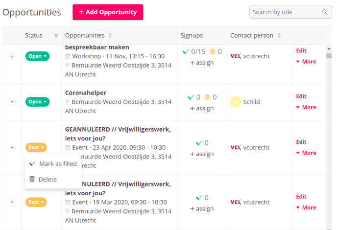 If an opportunity has already started, it is marked 'past'. In contrast to opportunities that are set to 'full', you can't just open a past opportunity again. The end date of the opportunity is in the past.