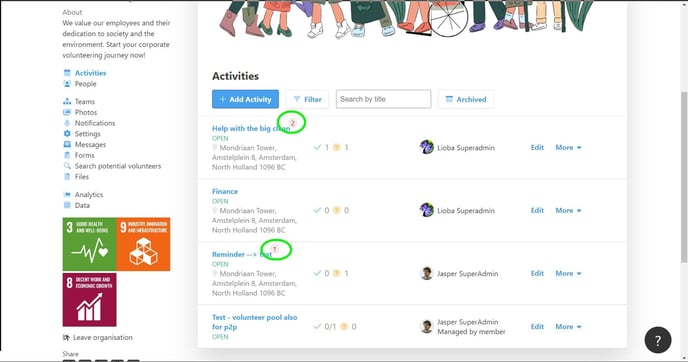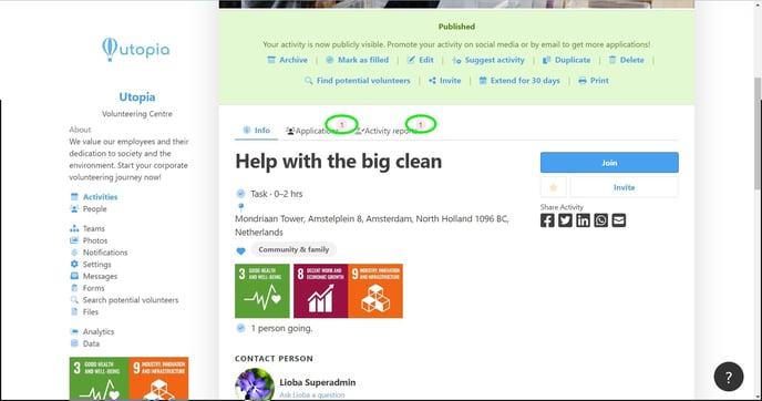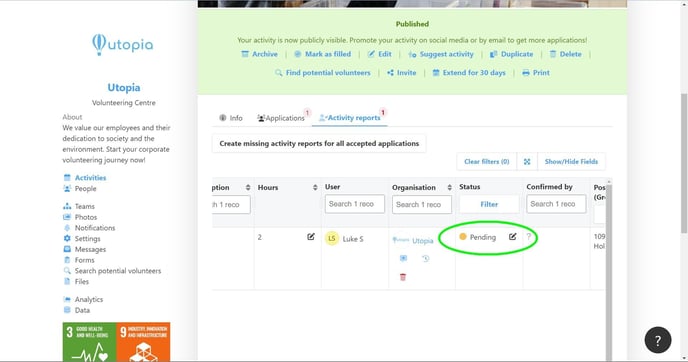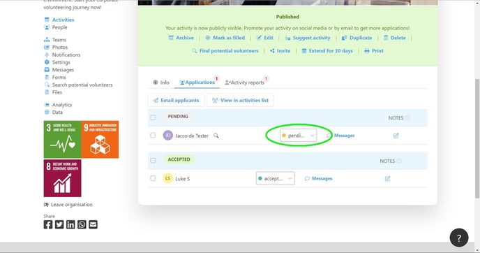 You can update the status of the applications and activity reports via the activity / opportunity overview list on your organisation page or via the activity / opportunity detail page. See below: