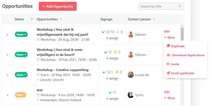 Click on the button “More”, on the right side of the opportunity in the opportunity overview (organisation page > opportunities tab). Select "Invite"