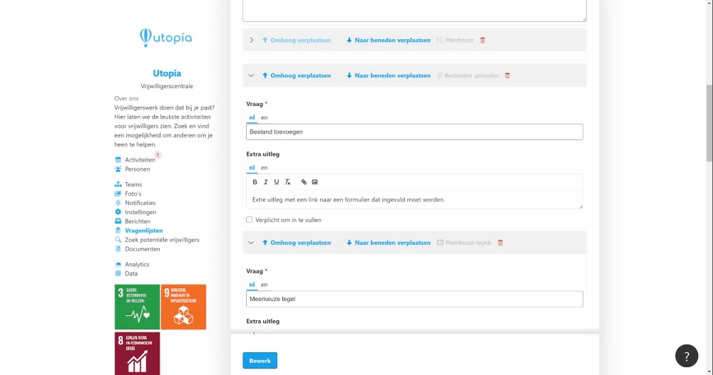 Now you can get started with the content. You can indicate per question whether this is a mandatory question and/or add extra instructions if necessary. You can change the order of the questions by clicking the up arrow (↑) or down arrow (↓).