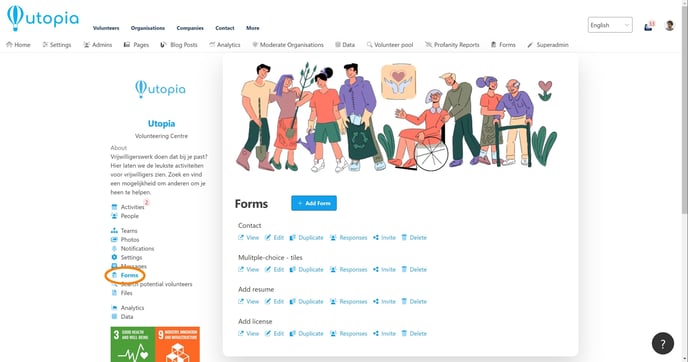 All forms can be found on the organization page (see the image below). This is also the only place where you can delete them. So you can remove a form from an activity / opportunity without losing it. This is also where you can download the data of users / volunteers who have applied for an activity / opportunity.