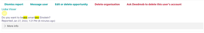 To ensure that no offensive content ends up on the site, all activities (opportunities, workshops and events) on the website are scanned for bad words. The list of bad words contains words from many languages, so a word that does not have a bad meaning in English can be picked up as a bad word! If a text contains one of the words from this list, it will be added to "reports" and you will get a notification. You have the following options: