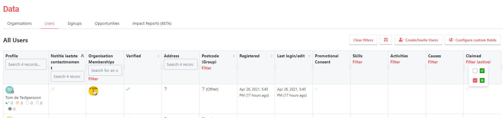 We advise every platform administrator to keep an eye on who has not claimed their account. You can do this by following the steps above to filter the unclaimed users first. If you then click on the username, you will see the corresponding e-mail address. This can be seen in the video below. You can send an e-mail to that address asking the user to activate his account, for example by creating a new password or by creating a new account. Questions on how to create an account can be found in this article. If he or she wishes to activate it, the password must be requested again. How that is done can be found in this article.