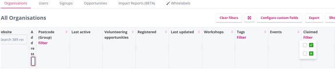 4. Click on the check mark to see all claimed organisations, or click on the cross to see unclaimed organisations.