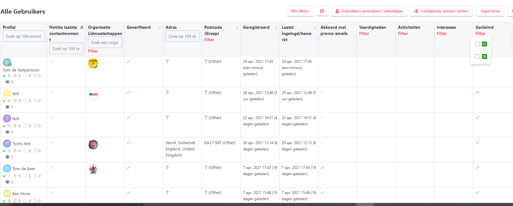 5. Het groene vinkje laat alle geclaimde gebruikers zien. Het groene kruisje laat de ongeclaimde gebruikers zien.