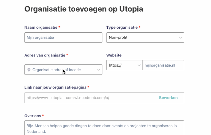 Je kunt aangeven of jouw organisatie een ANBI/SSBI status heeft als je een organisatiepagina aanmaakt. Meer informatie over het aanmaken van een organisatiepagina vind je hier. Op dit moment is er geen optie dit later aan te passen! We hebben dit gelimiteerd tot het aanmaken van organisaties om de partners (vrijwilligerscentrales, welzijnorganisaties) de kans te geven om deze ANBI/SBBI status te controleren.