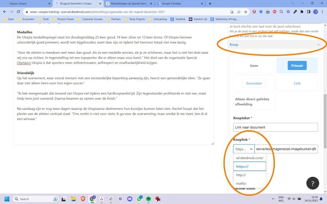 Knoplink: plak hier de gekopieerde url. Let op: zorg dat je 'https://' of 'http://' als voorzetsel gebruikt, anders werkt de link niet.