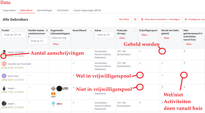 Vrijwilligerspool: een groen vinkje geeft aan dat een gebruiker in de vrijwilligerspool actief is, een grijs kruisje geeft aan dat een gebruiker niet in de vrijwilligerspool actief is. Een vraagteken geeft aan dat dit onbekend is (dus dat deze stap is overgeslagen, of dat deze stap nog niet aan de orde is geweest).
