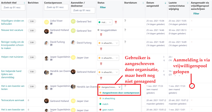 Aangemaakt via vrijwilligerspool aanschrijven: dit tabje geeft aan of deze aanmelding via de vrijwilligerspool is aangemaakt. Zo kan je direct zien -ook wanneer de status van de aanmelding is veranderd' of deze aanmelding plaats heeft gevonden via de vrijwilligerspool.