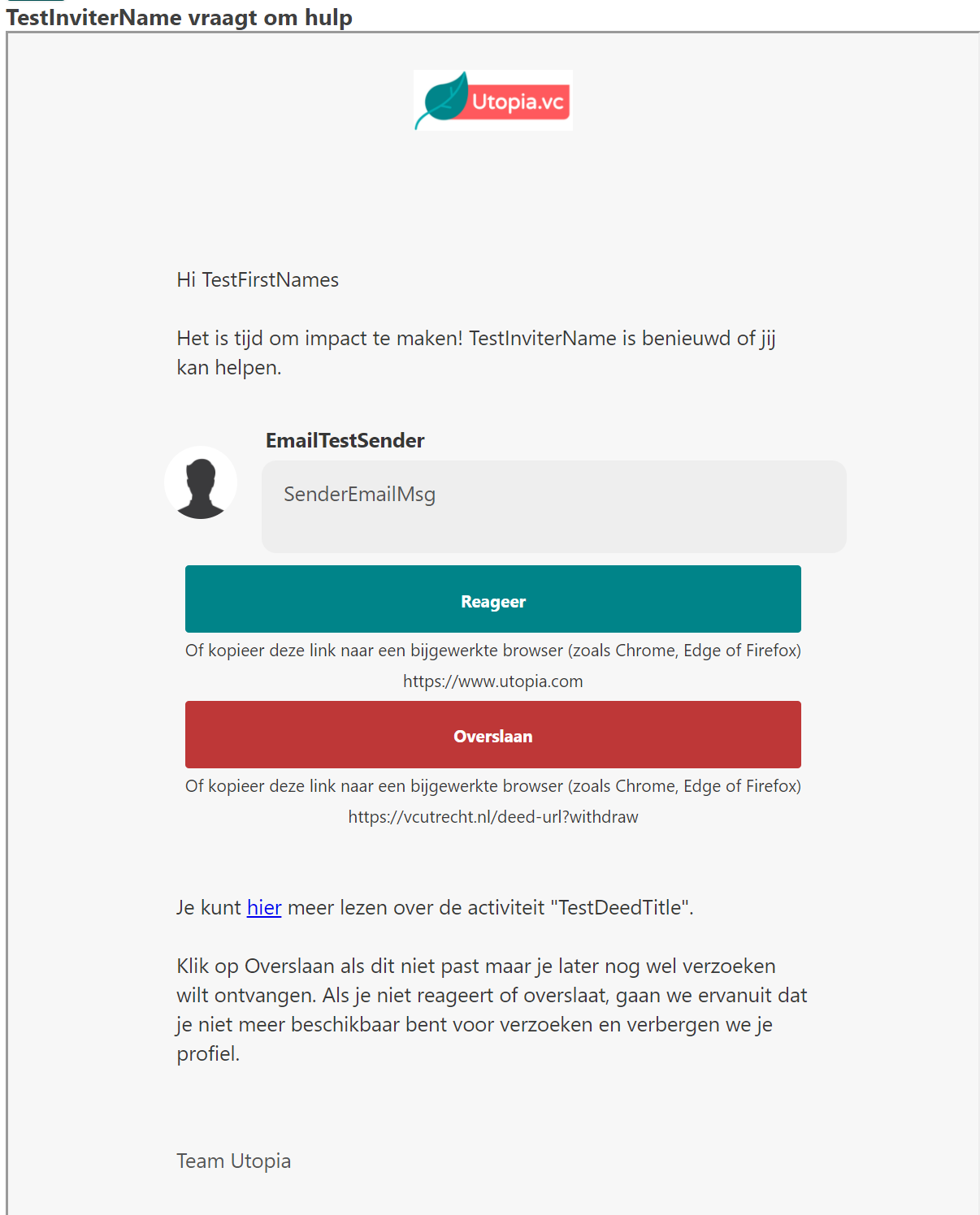 Tot slot wordt er een nieuwe automail geactiveerd: invitedToDeedViaVolunteerBank. Deze wordt verzonden naar gebruikers wanneer ze door een contactpersoon van een organisatie worden uitgenodigd via de vrijwilligerspool. Waar je de e-mail kan vinden en aanpassen, vind je in dit artikel. De e-mail ziet er als volgt uit: